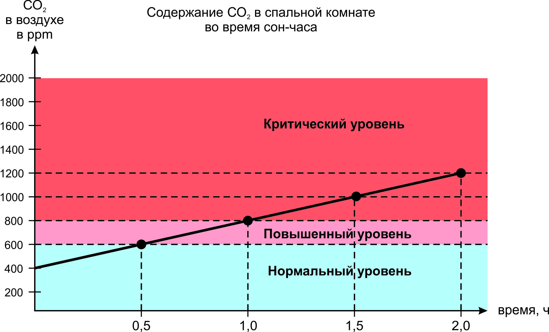 А теперь давайте продемонстрируем эти утверждения языком цифр. Допустим, что перед сон-часом комнату хорошо проветрили и содержание СО2 в ней приблизилось к отметке 400 ррм, как на свежем воздухе. (Примечание. ррм – это единица измерения содержания газа в воздухе, 1 ррм – это одна молекула конкретного газа на 1 миллион всех молекул воздуха). После этого дверь закрыли на два часа.