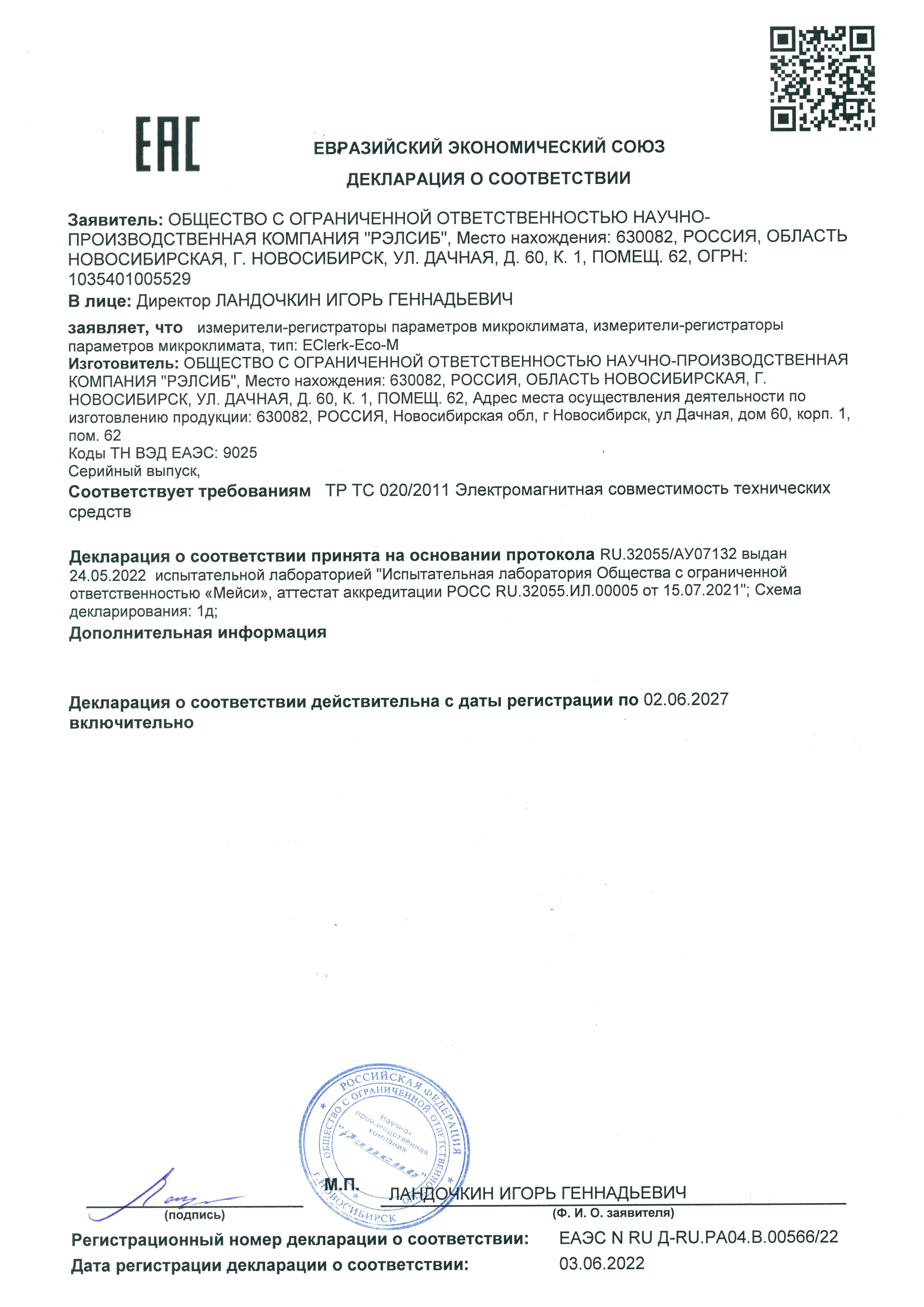 Измеритель-регистратор EClerk-Eco-M-RHTC-11-LTE предназначен для измерений и регистрации важнейших параметров воздушной среды: температуры, относительной влажности воздуха и концентрации углекислого газа в воздухе (СО2), визуализации измеренных значений на ЖК дисплее, регистрации измеренных значений во встроенном модуле энергонезависимой памяти, передаче измеренных значений в облачный сервис RelsibCloud посредством встроенного интерфейсного модуля LTE. Прибор может применяться в домашних условиях, в образовательных и медицинских учреждениях, на предприятиях фармацевтики, микроэлектроники и т.д.