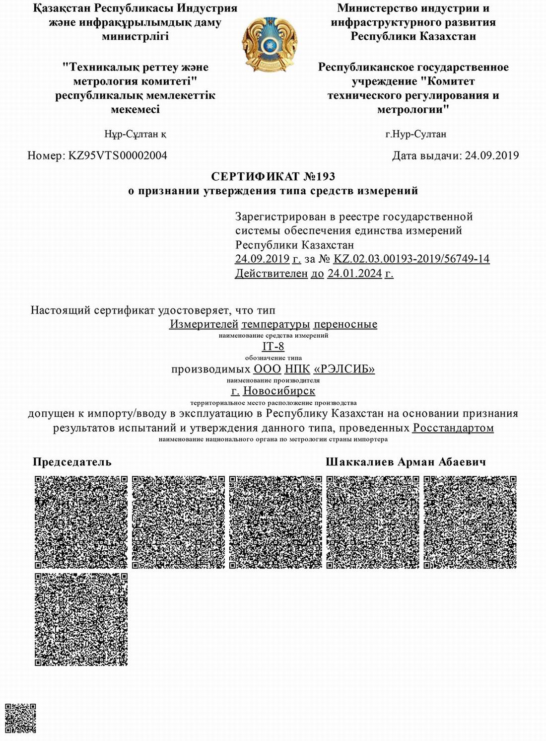 Сертификат о признании утверждения типа средств измерений в респ. Казахстан