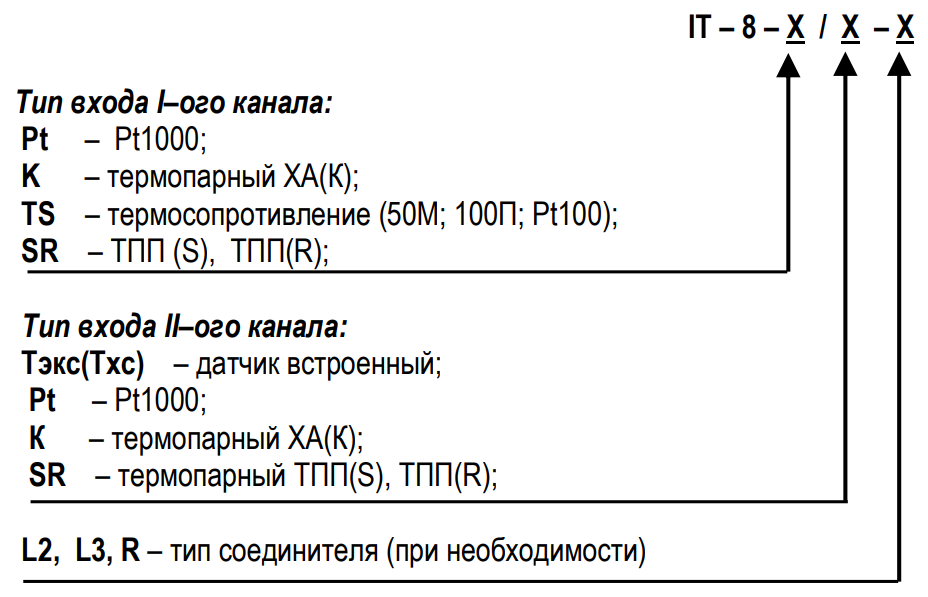 В зависимости от типа входа каждого канала и конструкции соединителей имеются восемь модификаций измерителя IT-8.