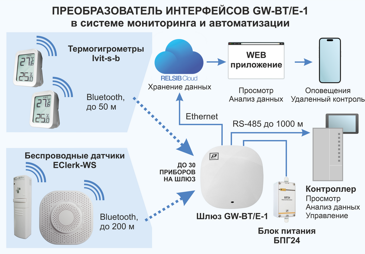 Преобразователь интерфейсов GW-BT/E-1 предназначен для приёма данных по беспроводному интерфейсу Bluetoothс приборов НПК "Рэлсиб": датчиков EClerk-WS, термогигрометров Ivit-(s)-1-B, имеющих интерфейс Bluetooth c последующей передачей данных по проводному Ethernet в облачный сервис RelsibCloud и по RS485 Modbus в систему автоматизации для контроля и управления.