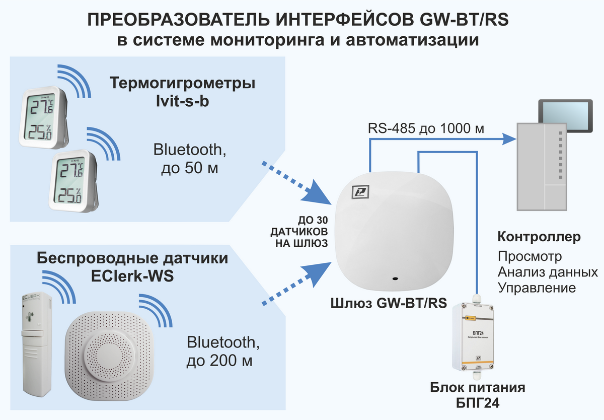 Преобразователь интерфейсов GW-BT/E-1 предназначен для приёма данных по беспроводному интерфейсу Bluetooth с приборов НПК "Рэлсиб": датчиков EClerk-WS, термогигрометров Ivit-(s)-1-B имеющих интерфейс Bluetooth c последующей передачей данных по RS485 Modbus в систему автоматизации для контроля и управления.
