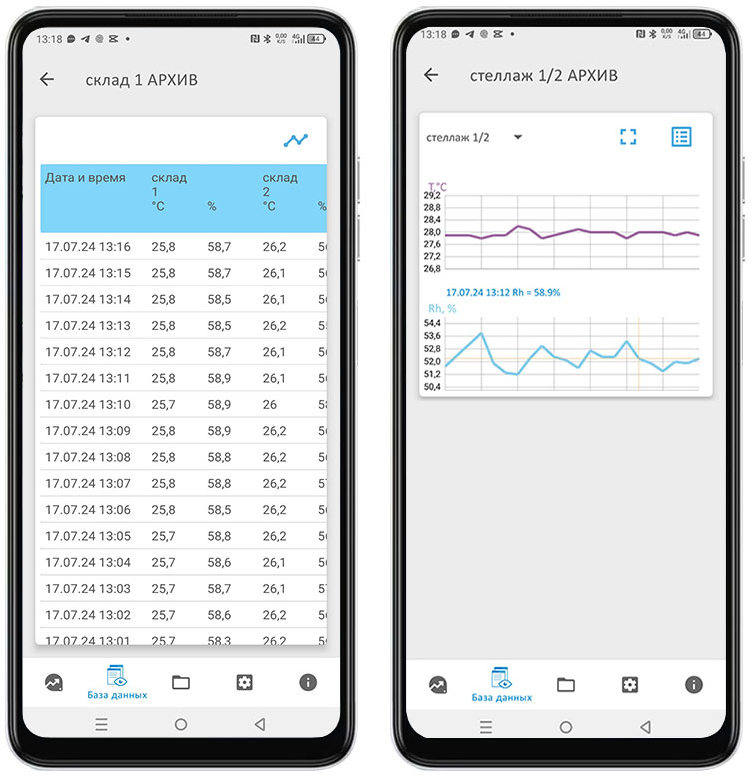 Приложение не только отображает вам текущие показания датчика, но и собирает их в архив. Полученные с датчиков данные могут быть выведены в виде отчёта или графика. В приложении могут быть зарегистрированы несколько датчиков, к примеру датчик на стене помещения и датчик в чехле инструмента.