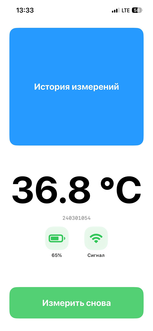 Когда измерение закончено, на экране показывается результат — например, 36,8 °C. Под температурой отображается идентификатор измерения. Ниже — заряд батареи термометра и уровень сигнала. Внизу экрана — зелёная кнопка «Измерить снова»: нажмите её, чтобы провести новое измерение. Результат и кнопки озвучивает встроенный голос приложения, если VoiceOver выключен; при включённом VoiceOver всё читает VoiceOver.
