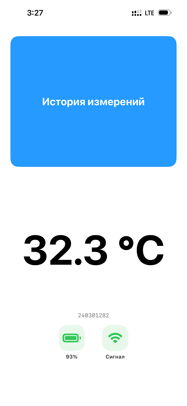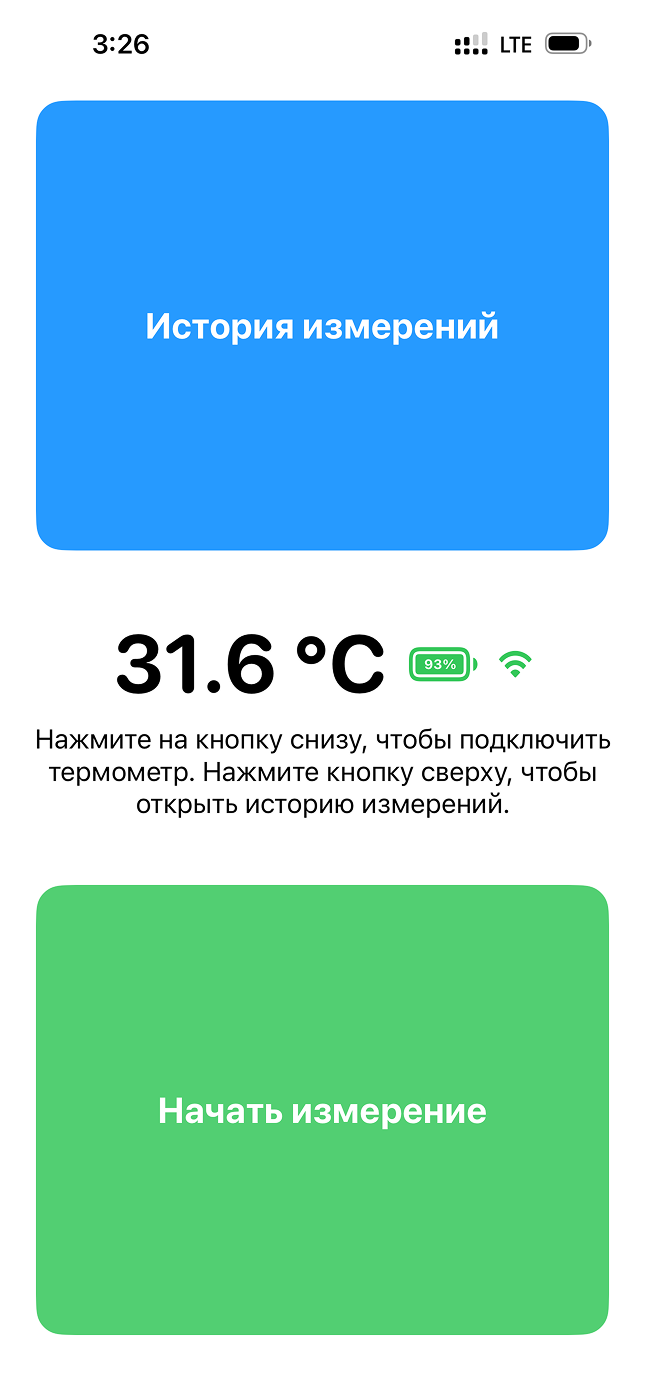После запуска приложения вы видите главный экран. Сверху — синяя кнопка «История измерений»: по нажатию откроется список прошлых измерений. По центру отображается текущая температура (например, 31,6 °C), справа от неё — заряд батареи термометра и уровень сигнала. Ниже — подсказка: «Нажмите на кнопку снизу, чтобы подключить термометр. Нажмите кнопку сверху, чтобы открыть историю измерений.» Внизу экрана — зелёная кнопка «Начать измерение»: нажмите её, чтобы подключить термометр и начать измерение. Все эти элементы озвучивает встроенный голос приложения, если VoiceOver выключен; при включённом VoiceOver все поля и кнопки читает VoiceOver.