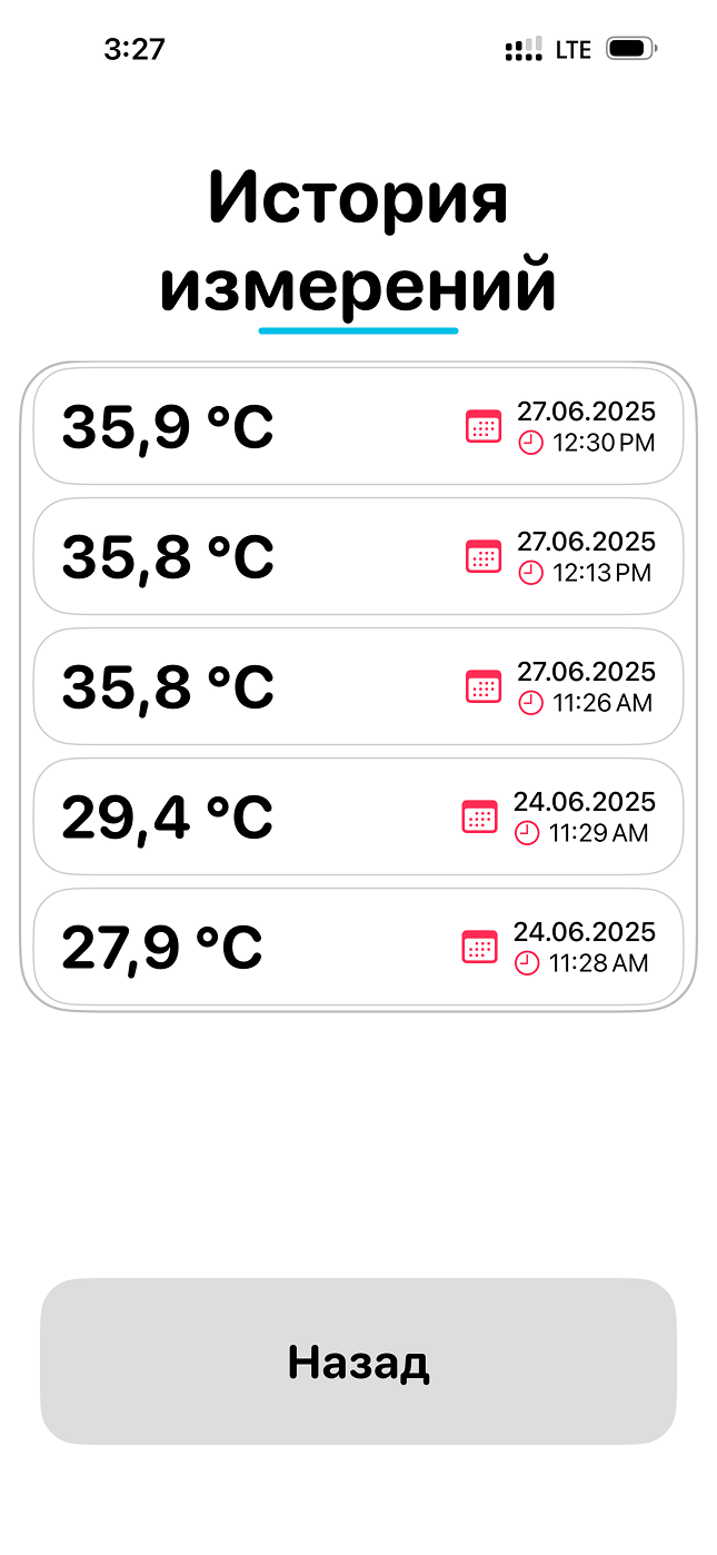 Нажав на синюю кнопку «История измерений» на первом экране, вы попадаете в список прошлых измерений. Заголовок «История измерений» выделен синим. Каждое измерение показано в отдельной карточке: температура (например, 35,9 °C), дата (27.06.2025) и время (12:30). Список упорядочен от новых к старым. Внизу экрана — серая кнопка «Назад» для возврата на главный экран. Список и кнопки озвучивает встроенный голос приложения при выключенном VoiceOver; при включённом VoiceOver все поля читает VoiceOver.