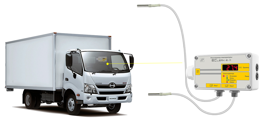 Нужно закрепить датчики температуры в нужных местах кузова и вывести кабели в кабину водителя. Например, один из датчиков можно использовать для контроля температуры перевозимых продуктов, а другой – для контроля температуры воздуха внутри кузова.