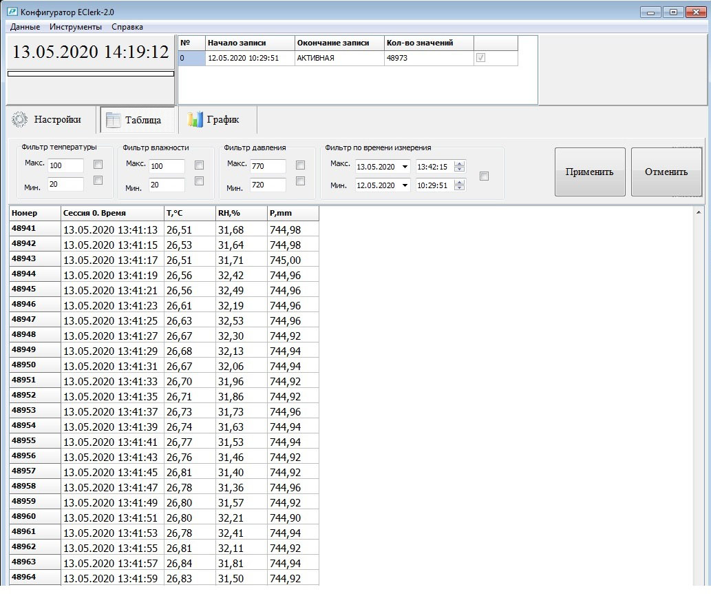 Для работы с прибором (конфигурирование, анализ данных, формирование Отчёта) имеется программа EClerk-2.0.