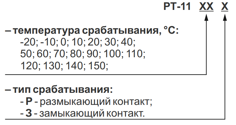 | Температура срабатывания, °С | -20; -10; 0; +10; +20; +30; +40; +50; +60; +70; +80; +90; +100; +110; +120; +130; +140; +150 |