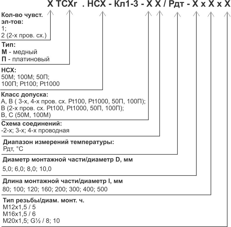 | Номер исполнения | Тип клеммной головки* | Диаметр монтажной части, D,мм | Тип резьбы | Длина монтажной части, I, мм |