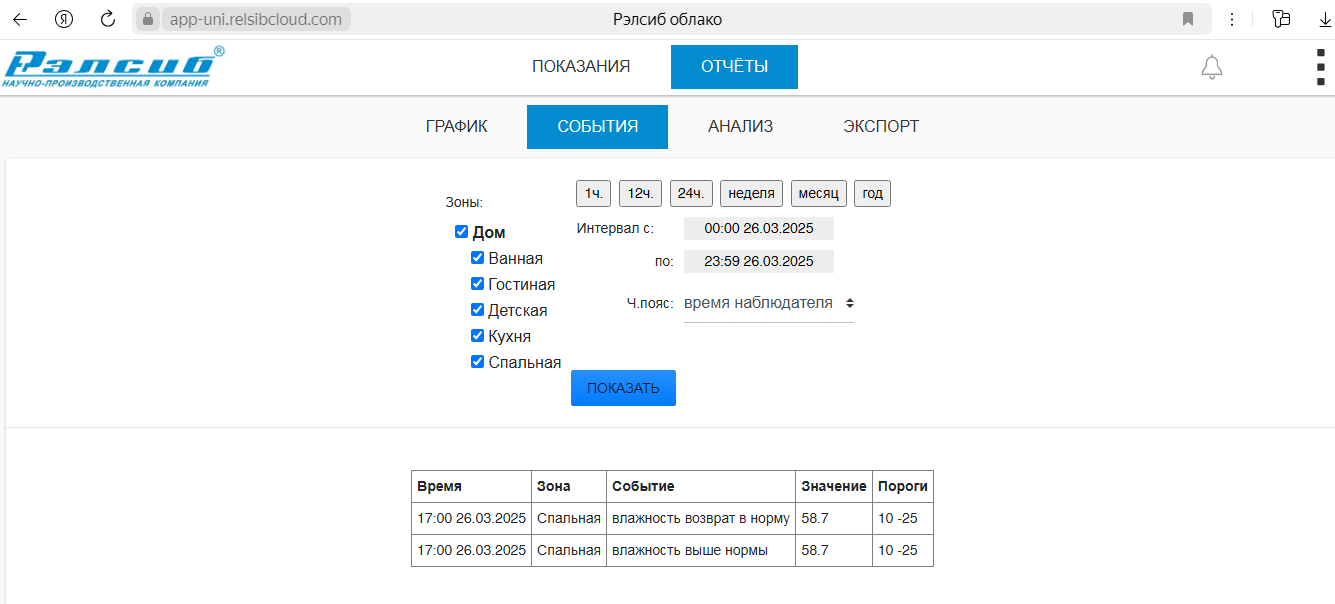 На вкладке События можно посмотреть Журнал событий- выход параметров за установленные нормы.